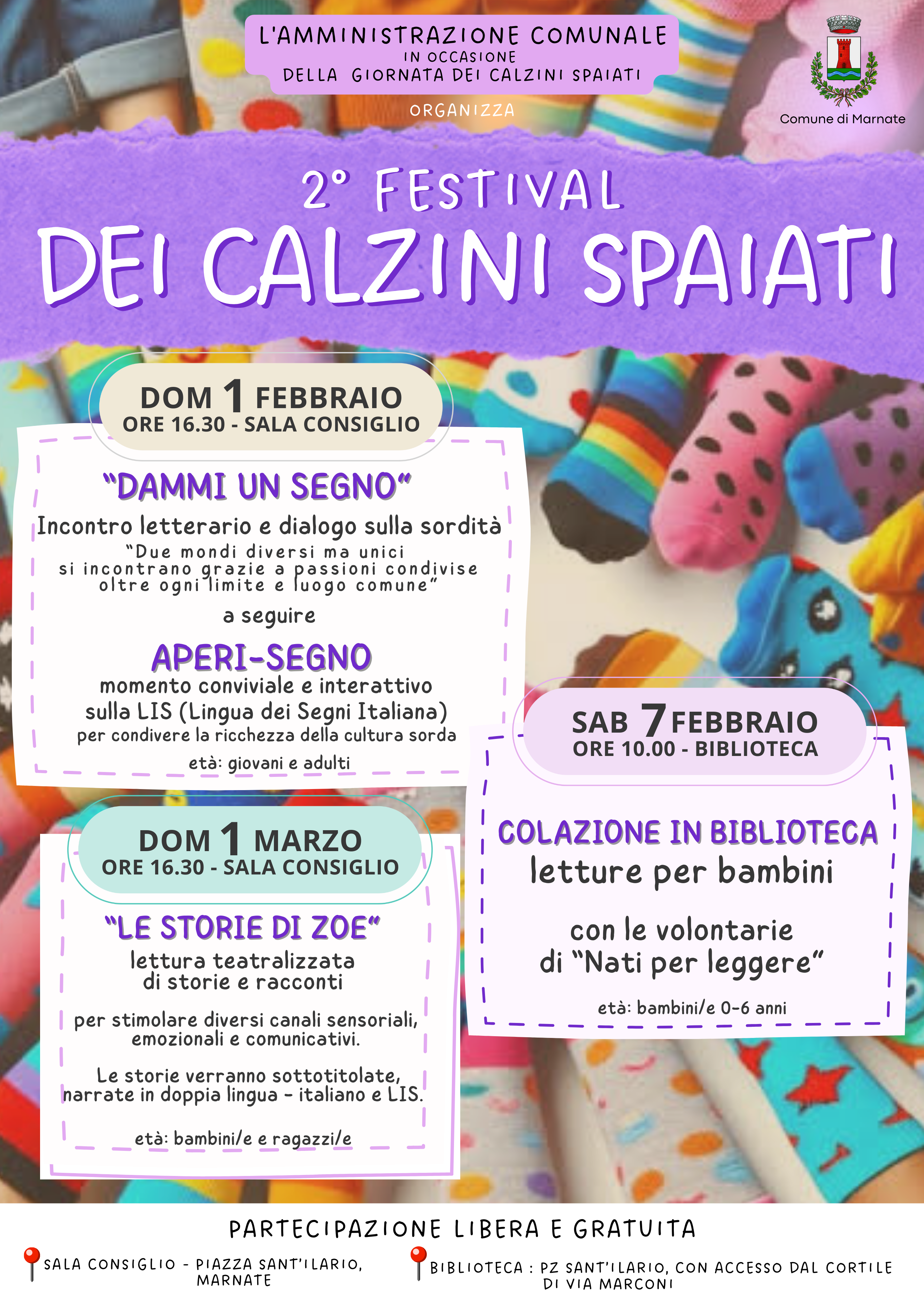 Anche quest’anno in occasione della Giornata dei Calzini Spaiati, l'Amministrazione comunale organizza il Festival dei Calzini Spaiati: una serie di iniziative dedicate alla valorizzazione della diversità e all’importanza di crescere nel rispetto degli altri.