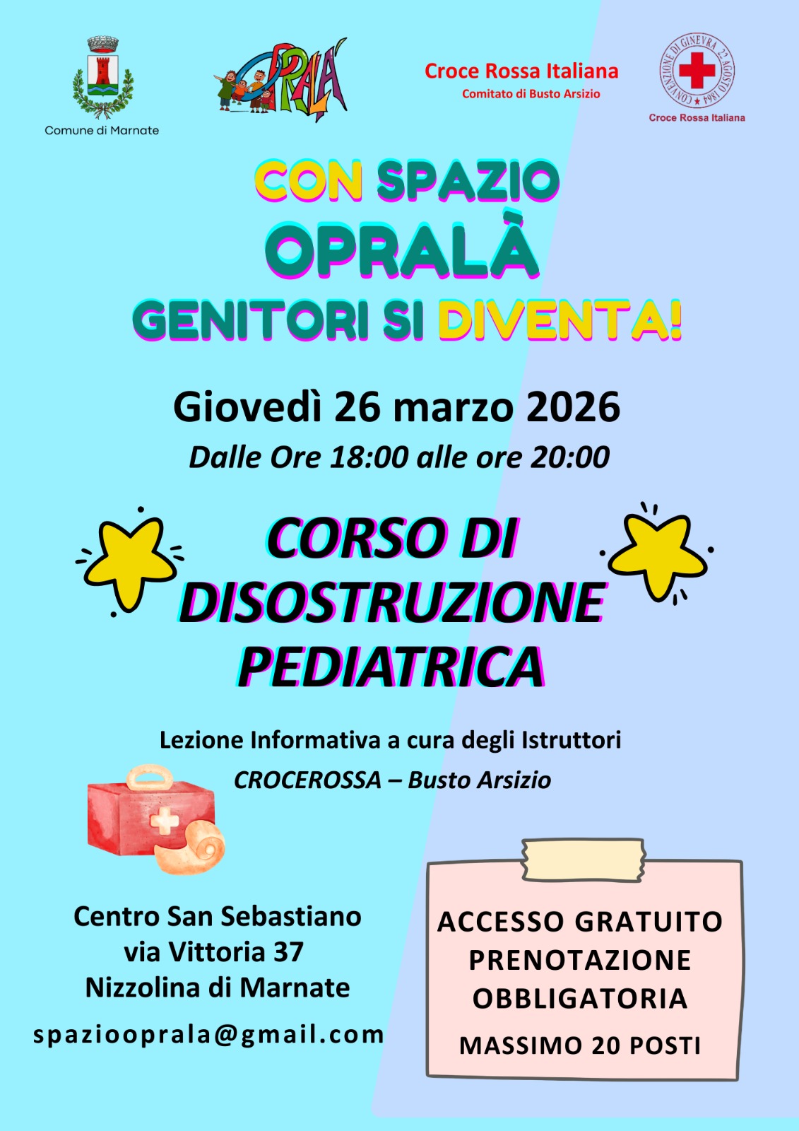 Giovedì 26 marzo 2026, dalle ore 18.00 alle ore 20.00, si terrà infatti un corso di disostruzione pediatrica, una lezione informativa a cura degli istruttori della Croce Rossa Italiana – Comitato di Busto Arsizio.