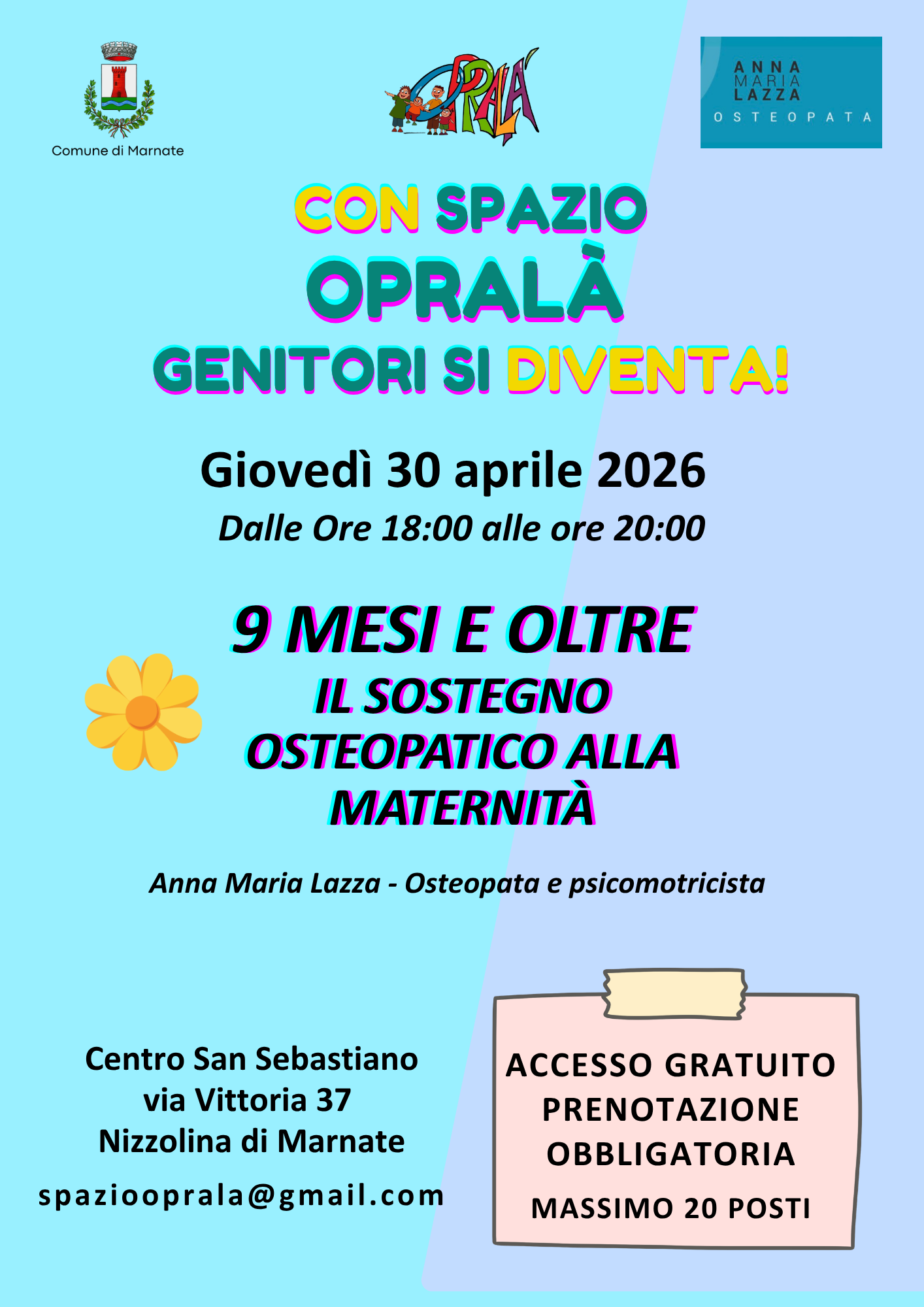 L’evento rappresenta un’occasione per approfondire il ruolo dell’osteopatia durante la gravidanza e nel periodo successivo al parto, offrendo strumenti utili per il benessere della mamma e del bambino ed è condotto da Anna Maria Lazza, osteopata e psicomotricista.