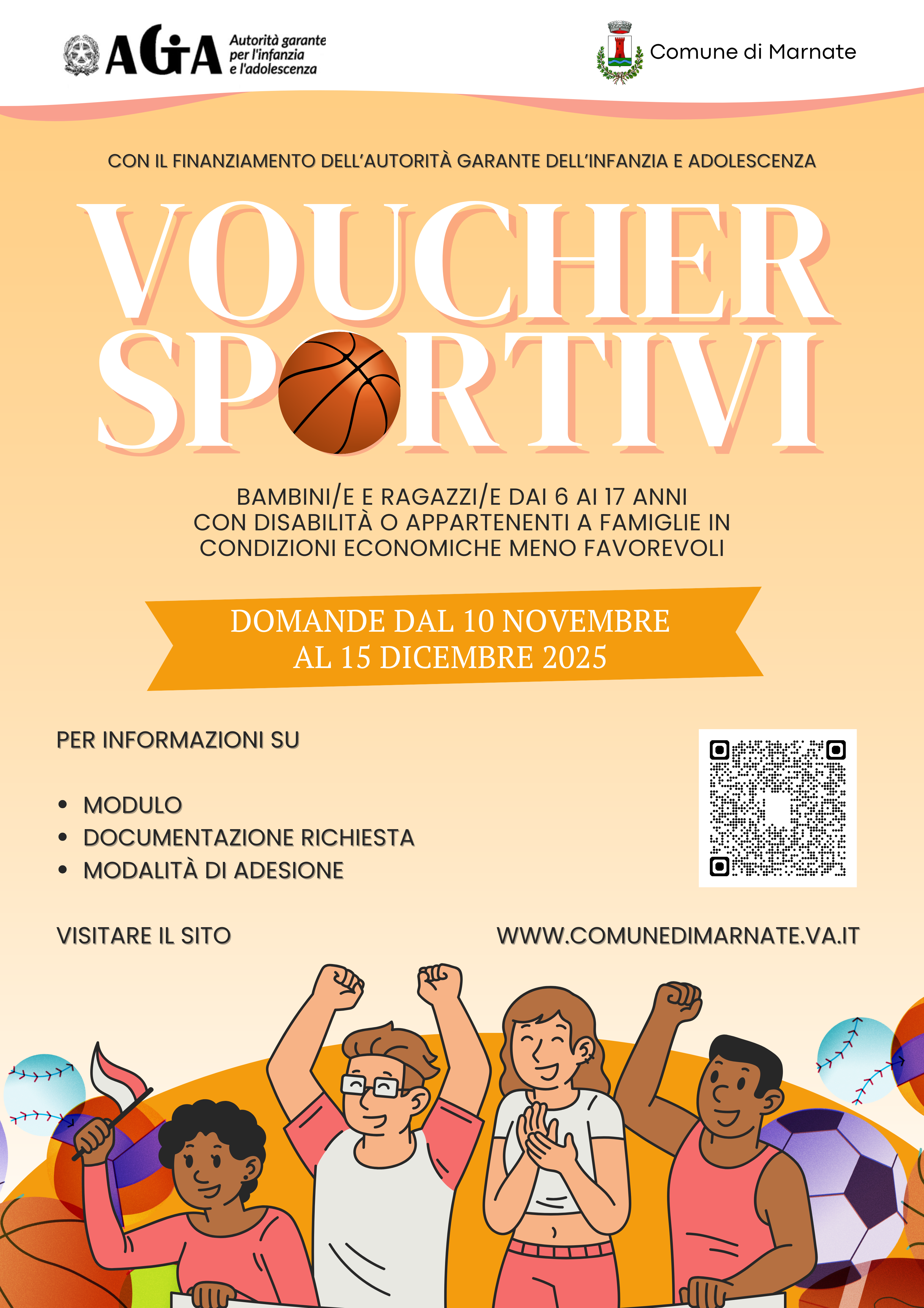 Il Comune di Marnate ha aderito all’iniziativa dell’Autorità Garante per l’Infanzia e l’Adolescenza di promozione delle attività sportive per i minorenni di età compresa tra 6 e 17 anni, risultando beneficiario per l’EROGAZIONE DI VOUCHER FINALIZZATI ALLA PROMOZIONE DI ATTIVITÀ SPORTIVE PER BAMBINI E RAGAZZI CON DISABILITÀ O APPARTENENTI A FAMIGLIE IN CONDIZIONI ECONOMICHE MENO FAVOREVOLI ANNO SPORTIVO 2025/2026.